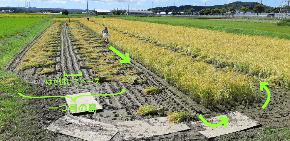 ②刈り終えると、各島の中央に3条分ほどのスペースができ、それを挟んで稲束が左右に向いて並ぶ(このスペースを使ってはざ掛けをする
