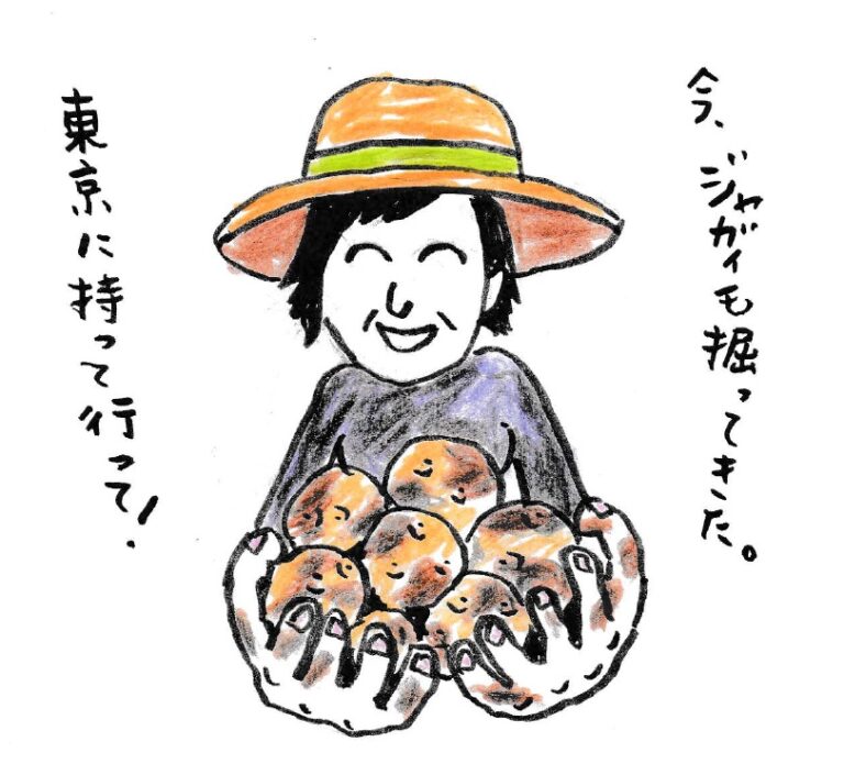 親族の結婚に伴い妻と二人で上京しようという朝、村のかあちゃんの一人カズコさんが、「東京に行くの? そりゃめでたいねー! ちょっと待ってて! 畑でジャガイモ掘ってくるから!」そう言って勢いのまま、カズコさんは泥つきのジャガイモを掘ってきた。家族に持っていってあげなさいということらしい。いつも飾らないカズコさんらしいねと、夫婦で笑った。